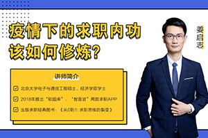 简介: 本课程是以大学生为对象的求职参考,内容包括你到底需要一份什么样的工作,在求职季你该如何准备,从HR的角度谈简历制作,论求职信与叉烧饭的关系,如何回答网申开放性问题,传说中的那些“烧脑”小学数学题,如何在群面中脱颖而出,如何通过情景构建应对面试问题,犹豫不决不代表慎重选择,求学、求职、跳槽、转行的艰难抉择等。